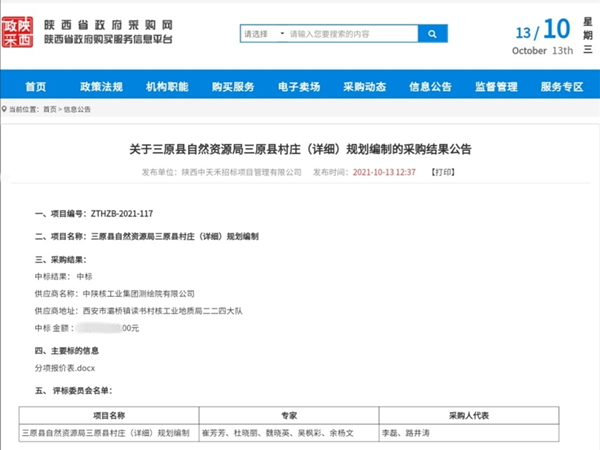 10月11日,由三原縣自然資源局組織的三原縣村莊(詳細)規(guī)劃編制采購項目在西安經(jīng)開區(qū)開標,現(xiàn)場公布了開標結(jié)果,中標人為中陜核工業(yè)集團測繪院有限公司,中標金額為2374.3萬元,中標金額打破了測繪院記錄,創(chuàng)造了測繪院市場開拓的新高度。