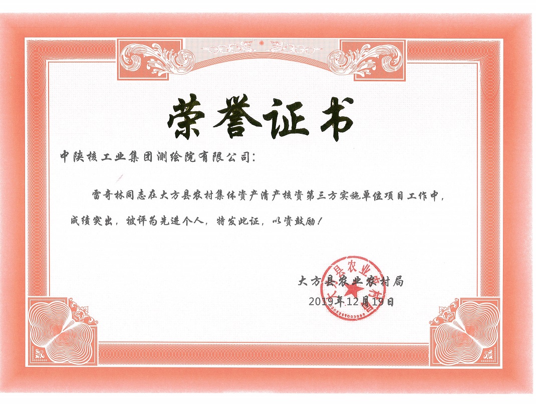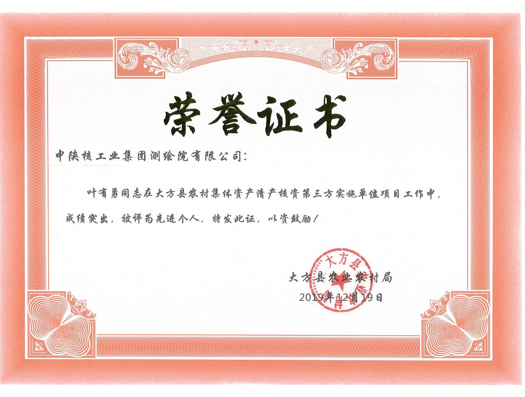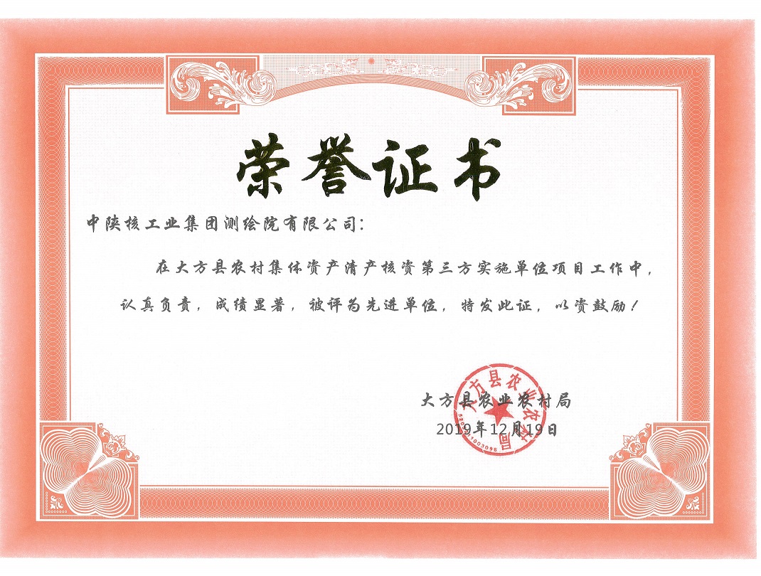 貴州省大方縣農(nóng)村集體資產(chǎn)清產(chǎn)核資項目是中陜核測繪院承攬的又一個跨省項目。該項目經(jīng)過中陜核測繪院大方項目班組全體工作人員的辛勤努力工作,2019年12月19日,被貴州省大方縣農(nóng)業(yè)農(nóng)村局授予“先進單位”榮譽稱號。該榮譽的取得,是地方政府對中陜核測繪院工作的肯定,也是對該項目工作人員的鼓勵,它必將進一步增強該項目生產(chǎn)工作人員做好優(yōu)質(zhì)項目的信心和決心。