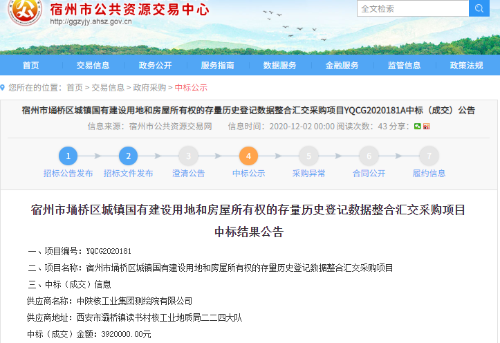 測繪院中標宿州市埇橋區(qū)城鎮(zhèn)國有建設用地和房屋所有權的存量歷史登記數(shù)據(jù)整合匯交采購項目