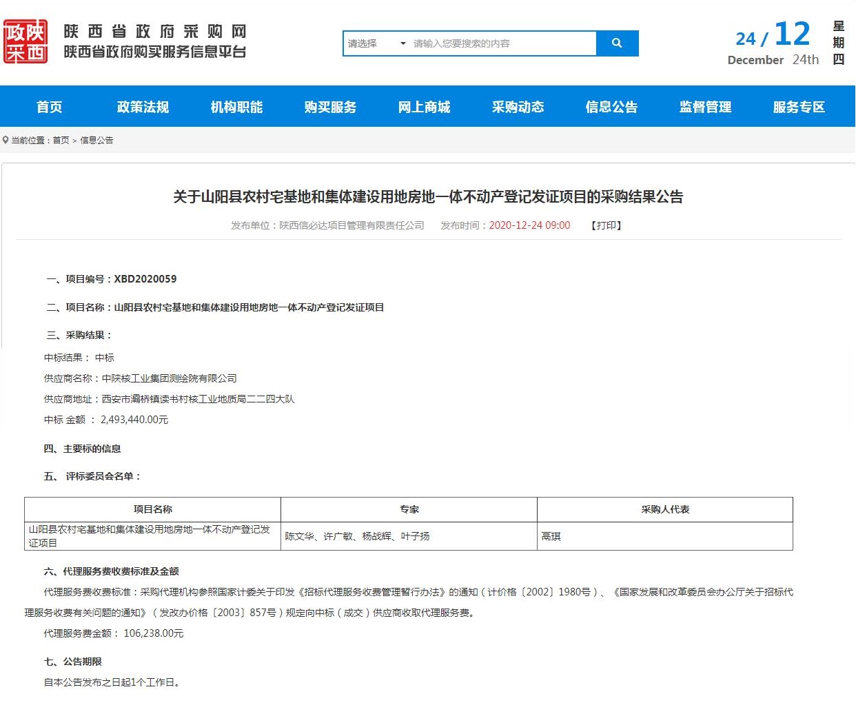 近日從陜西省政府采購(gòu)網(wǎng)獲悉,二二四大隊(duì)測(cè)繪院在山陽(yáng)縣農(nóng)村宅基地和集體建設(shè)用地房地一體不動(dòng)產(chǎn)登記發(fā)證項(xiàng)目招標(biāo)中拔得頭籌,成功中標(biāo)該項(xiàng)目,中標(biāo)價(jià)249萬(wàn)余元。