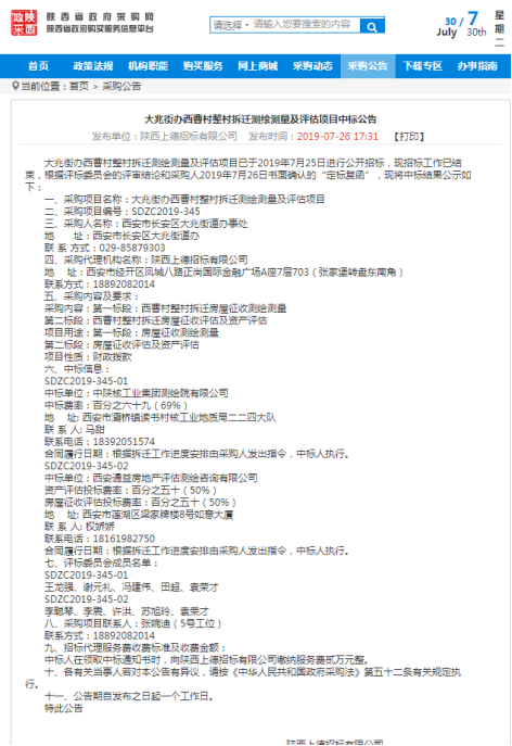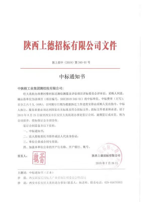 7月26日下午,中陜核測(cè)繪院劉鵬博傳來(lái)喜訊,公司憑借公司資源優(yōu)勢(shì)和綜合實(shí)力,在與其他五家測(cè)繪單位的競(jìng)標(biāo)中脫穎而出,成功中標(biāo)長(zhǎng)安區(qū)大兆街辦西曹村整村拆遷測(cè)繪測(cè)量及評(píng)估項(xiàng)目(第一標(biāo)段:房屋征收測(cè)繪測(cè)量)。